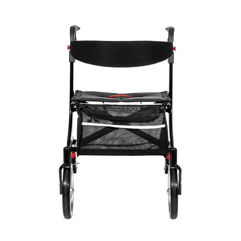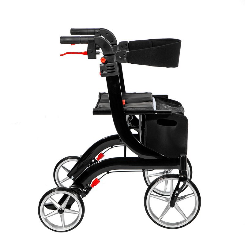 Четырехколесные алюминиевые ходунки черного цвета 84,5-96,5 см высотой. Складываются. Удобная корзина. Ручной тормоз.