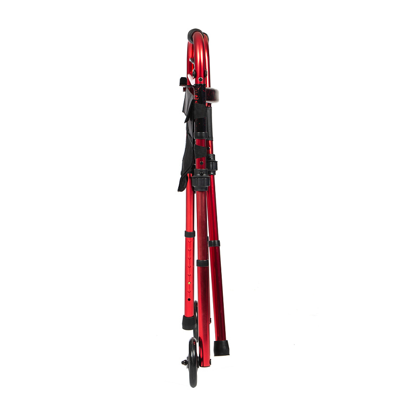 Двухколесные алюминиевые ходунки красного цвета 83,5-101 см высотой. Складываются. Имеются карманы для вещей. Регулируется по высоте.