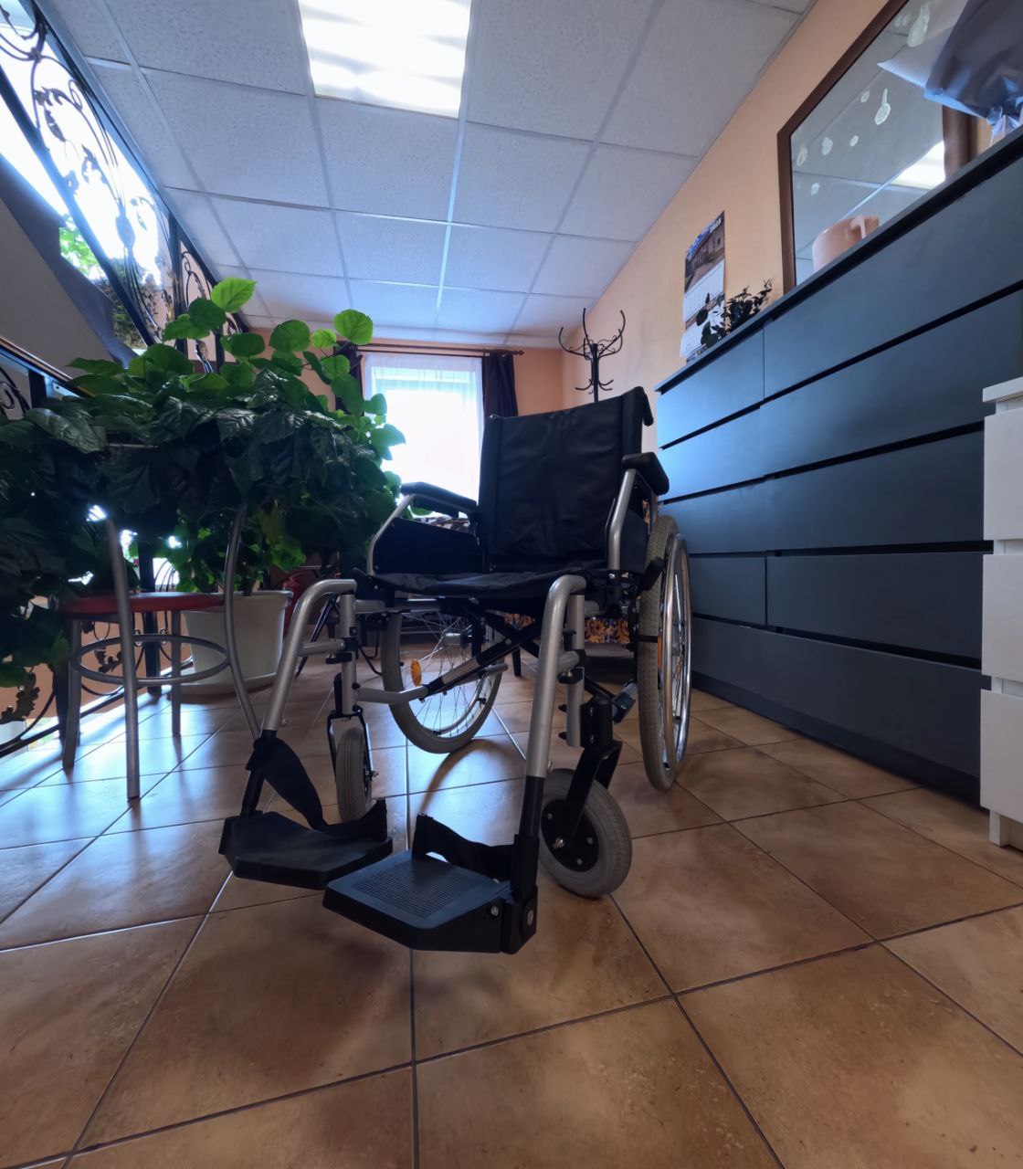 Широкая коляска с мягкой подставкой при переломе голени