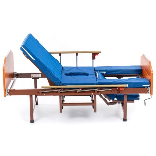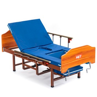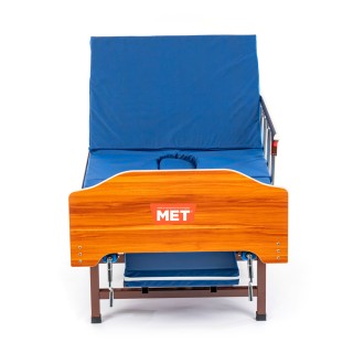 MET TARYS с независимыми винтовыми регулировками угла наклона спинной секции и положения секций. Боковые ограждения в комплекте. Опускающаяся ножная секция позволяет кровати занимать терапевтическое положение "кардио-кресло", показанное при лечении большинства кардио-заболеваний, а полноценное сидячее положение, достижимое с помощью такой конструкции ложа делает бодрствование больного максимально удобным и полноценным.