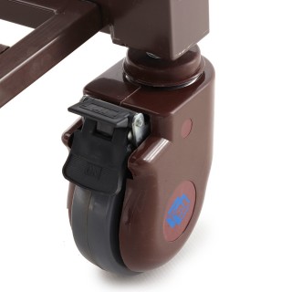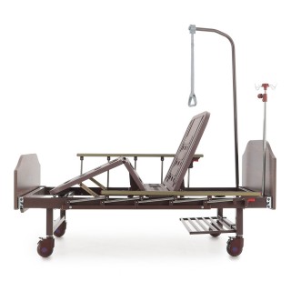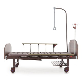 Каркасная рамка кровати изготовлена из стали с полимерным покрытием. Спинки выполнены из ламинированной древесностружечной плиты ЛДСП. Колеса выполнены двойными и оснащены индивидуальными тормозами. Штатив для капельниц с четырьмя крючками.