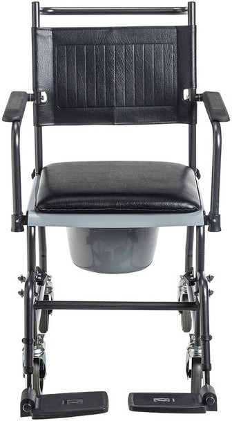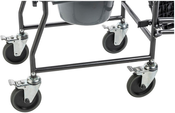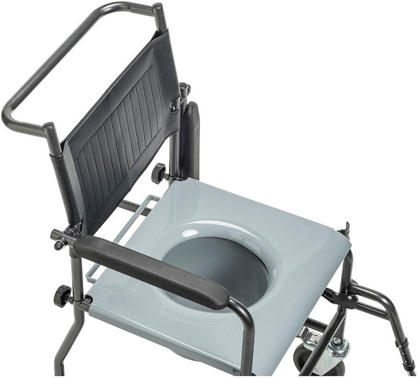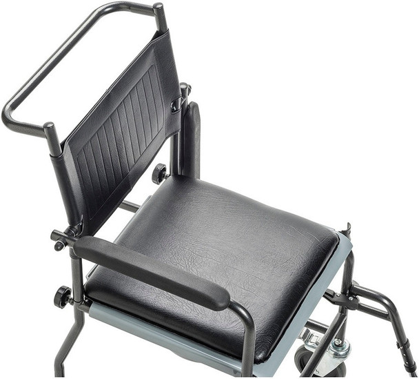 Спинка и сиденье имеют мягкие подкладки для вашего комфорта. Подлокотники снимаются для удобства перемещения. Кресло оснащено четырьмя поворотными колесами, что обеспечивает легкость перемещения и маневренности. Каждое колесо оснащено независимым тормозом для безопасности в неподвижном состоянии. Ведро-унитаз также снять, чтобы использовать её как обычную инвалидную коляску. Поставляется со съемной чашей и крышкой.