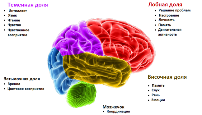 Когнитивные функции | Мышление, эмоции, поведение, планирование | Трудности с ориентацией в пространстве, речь, амнезия |