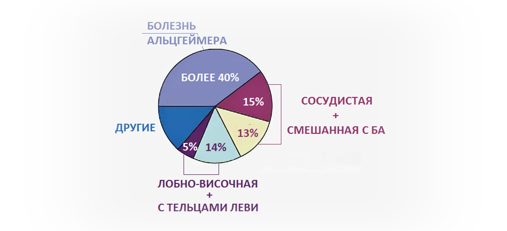 Этот вид когнитивного ухудшения – второй по распространенности после БА, диагностируется отдельно, но также в некоторых случаях становится причиной болезни Альцгеймера (см. Рис.1). В клинической практике для этого существует термин «смешанная деменция» – когда к нейрональной дегенерации, типичной для БА добавляется сосудистая патология. Симптомы деменции в этом случае могут дополнять друг друга, что становится причиной определенных сложностей в лечении.