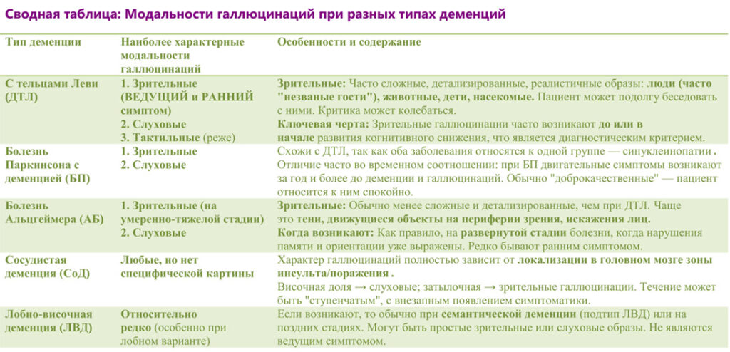 Деменция + галлюцинозы: таблица сочетанных форм