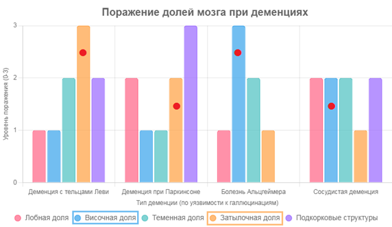 По большей части деменции сопряжены с ошибками восприятия зрительного поля, за что в головном мозге отвечают височная и затылочная доли. Эти области наиболее уязвимы при деменции с тельцами Леви и при болезни Паркинсона.